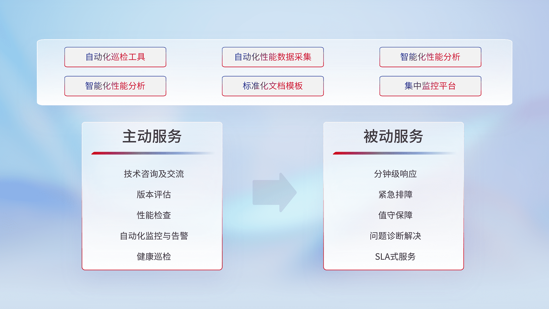 智能化工具和标准化文档,,,,保障服务质量,,提供主动服务(包含技术咨询、、、版本评估、、、、性能检查、、、、自动化监控与告警、、健康巡检)和被动服务包含(分钟级响应、、、紧急排障、、值守保障、、、、问题诊断解决、、、SLA服务)。。